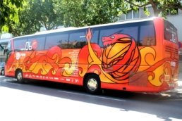 Diseño de la rotulación integral de dos autobuses para la gira y la celebración del triunfo del MUNDOBASKET para la FEDERACION ESPAÑOLA DE BALONCESTO.
